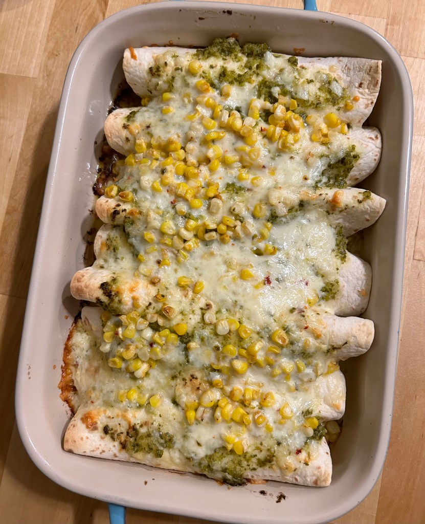 These are not your typical enchiladas. I make a jalapeno lime glaze/dressing/sauce (no idea what to call it) to pour over enchiladas filled with corn, Greek yogurt, chicken, and cheese. They are a little bit lighter but still make for a filling meal! I hope you try them out.