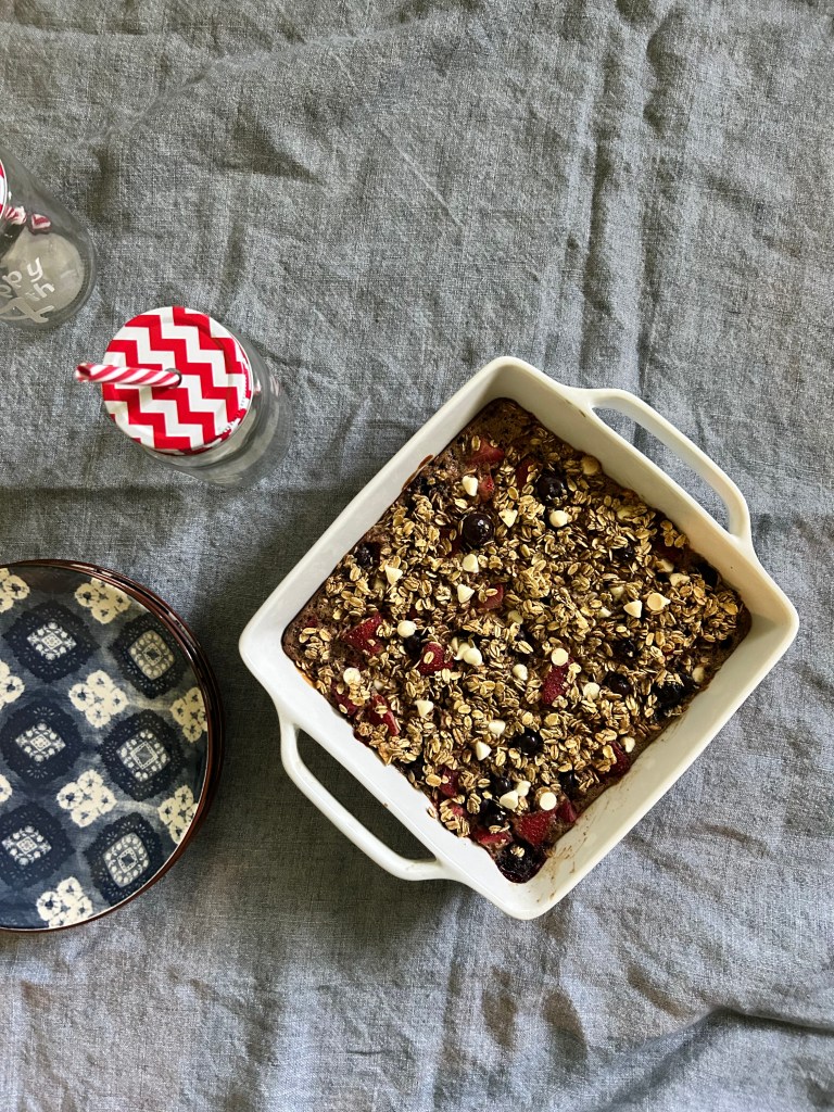 This baked oatmeal is the perfect summer breakfast and festive morning treat for the fourth. I have been eating this for the last two weeks non-stop! It is easy and quick to whip up, a great addition to a breakfast spread for guests, and absolutely delicious!