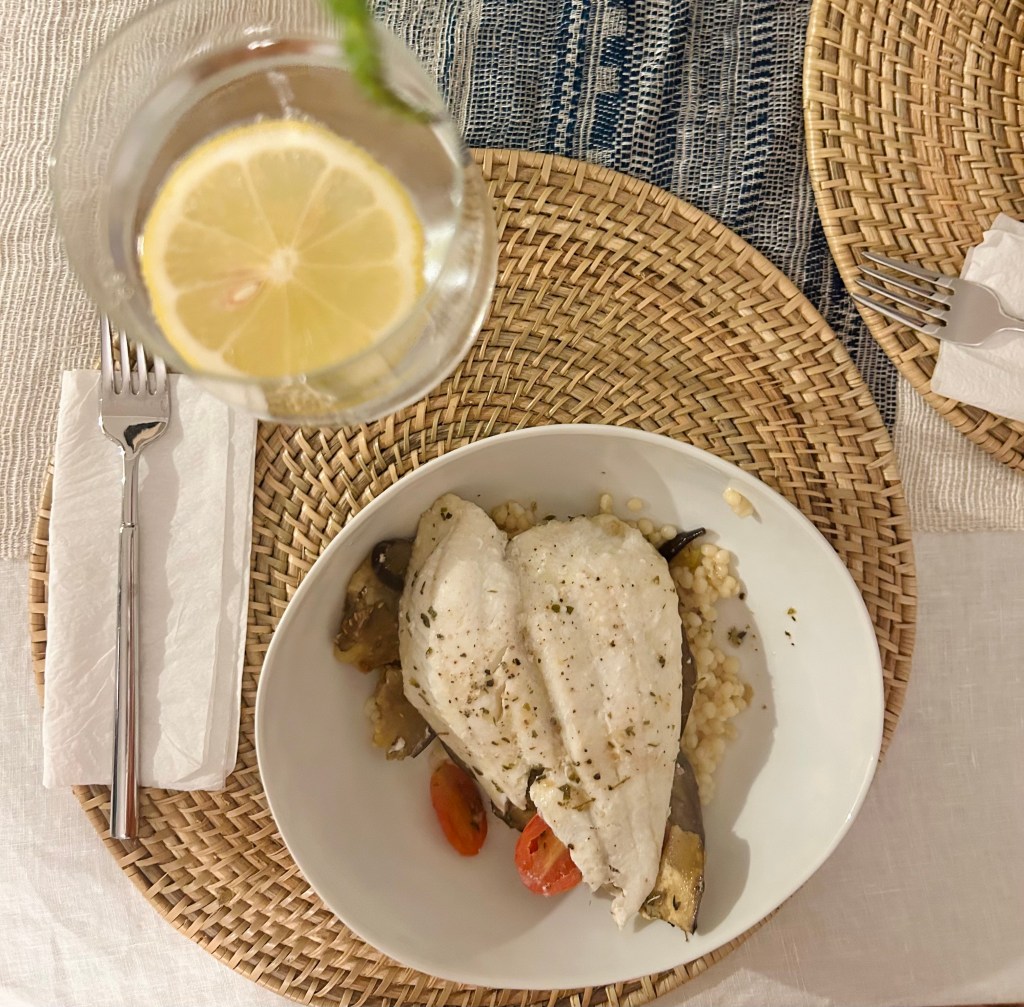 - On one half of the parchment paper layer 3 rounds of eggplant, a quarter of the tomatoes and 1 fish filet