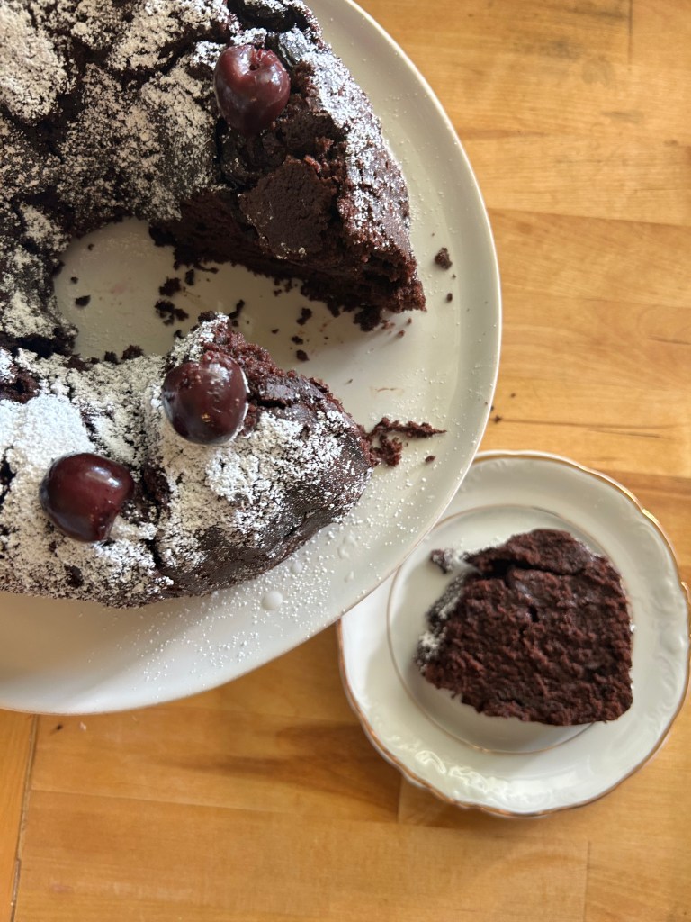 - Dust the cake with powdered sugar and top with more cherries if desired