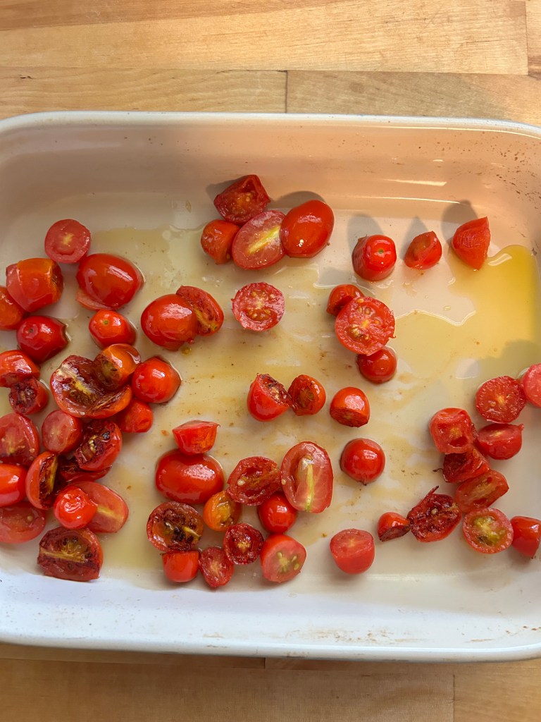 - Drizzle olive oil in a baking dish (8 x 12 inch) and pour the tomatoes on top