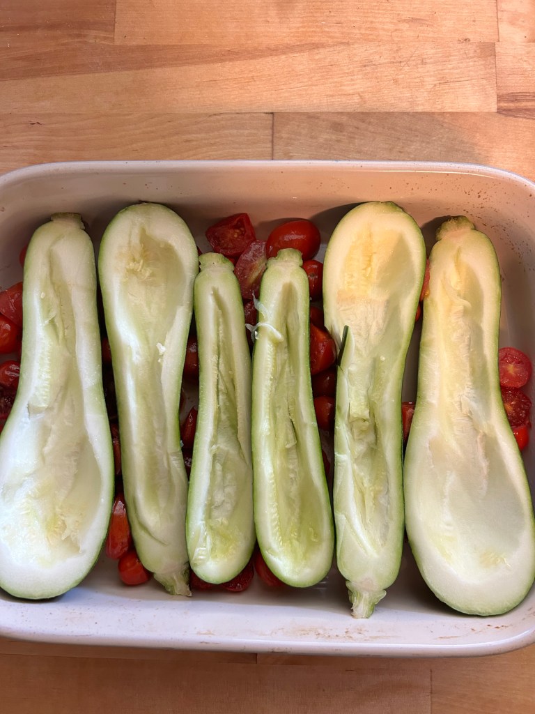 - Place each zucchini in the baking dish on top of the tomatoes skin side down, drizzle olive oil on top and season with 1/4 teaspoon salt and pepper