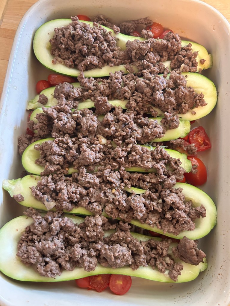 - Scoop the meat into each zucchini boat