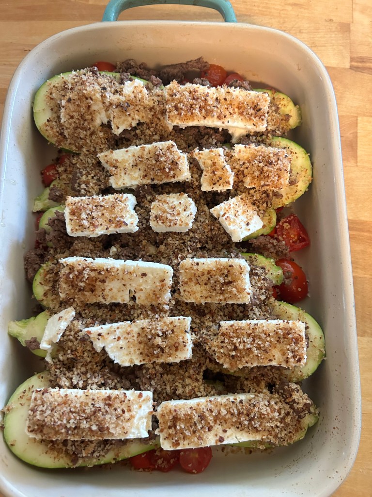- Top the zucchini boats with the feta and sprinkle the breadcrumbs over top