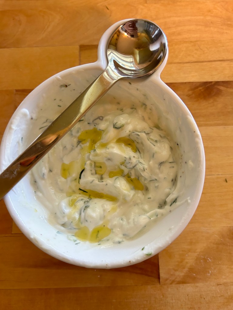 - Combine lemon juice and Greek yogurt in a bowl, grate in the cucumber and add in the remaining garlic, salt, and dill, combine completely and then drizzle the top with oil